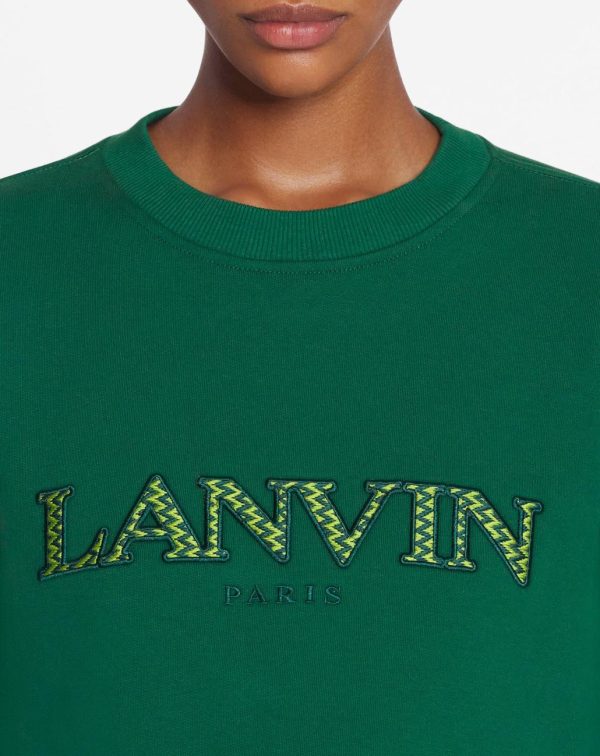 This piece is a cropped version of the sweatshirt inspired by the House’s iconic sneaker: the Curb. It features the timeless herringbone motif of the Curb which enhances the Lanvin logo on the chest.