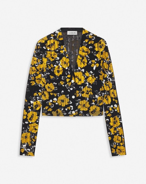 - Fitted V-neck cardigan in black cotton and silk with a floral overprint